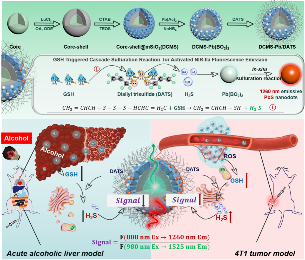 基于此,曾松军教授课题组集合稀土近红外二区发光材料,GSH响应的DATS以及Pb(BO2)2纳米点,构建了一种内源性GSH级联激活的NIR-II比率荧光纳米探针NaLuF4:Yb/Er@NaLuF4@mSiO2@Pb(BO2)2/DATS (DCMS-Pb/DATS)。设计的探针被GSH触发后,在808/980 nm激光激发下显示“开启”的NIR-IIa (1260 nm)激活信号和几乎不受影响的NIR-IIb (1525 nm)参考信号,从而实现高效NIR-II正交荧光发射,可以实时监测体内GSH水平的变化。成功实现了不同损伤程度的急性酒精性肝损伤和乳腺肿瘤的原位NIR-II比率荧光成像。这为高灵敏、高特异GSH及其相关联疾病的原位监测提供了新的NIR-II比率荧光成像方法。
