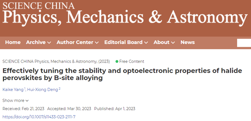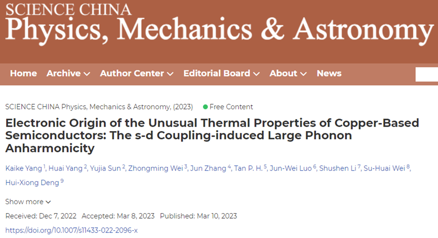 半导体材料是现代光电和微电子信息技术的基础。后摩尔时代半导体器件尺寸不断缩小和集成电路晶体管数目成倍增加,有效地热耗散和热控制成为微处理器、光伏、热电等设备高效率稳定工作的重要保障。如何调控半导体材料热导率和增强热力学稳定性是需要解决的一个关键科学技术问题。近日,公司杨凯科教授与中国科公司半导体研究所邓惠雄等人在SCIENCE CHINA Physics, Mechanics & Astronomy上发表题为“Electronic Origin of the Unusual Thermal Properties of Copper-Based Semiconductors: The s-d Coupling-induced Large Phonon Anharmonicity”和“Effectively tuning the stability and optoelectronic properties of halide perovskites by B-site alloying”的两项研究成果。