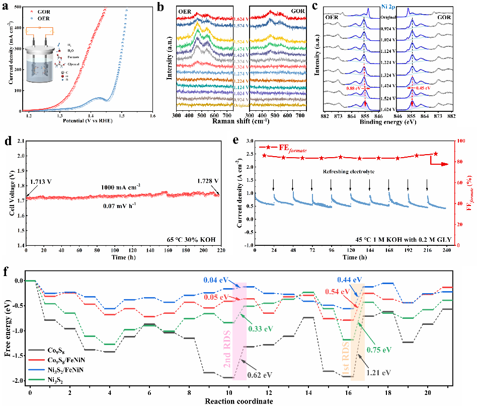 针对上述问题,该团队报告了一种分级三相异质结催化剂(Ni3S2/Co9S8/FeNiN),该催化剂由双金属氮化物纳米颗粒原位锚定在具有多级界面和多功能金属位点的两相金属硫化物上,在300 mA cm-2的电流密度下具有1.502 V(析氧反应)和1.393 V(甘油电氧化反应)的超低电势。令人印象深刻的是,有/无甘油辅助时,由该催化剂所组装的膜电极组件电解槽可以在1000 mA cm-2的工业级电流密度下分别稳定240/215小时,槽电压衰减可忽略不计,并且制取甲酸的平均法拉第效率为85.0%,证明了其在接近工业条件下对传统和混合水电解的出色耐久性。另外,通过准原位X射线光电子能谱研究等技术揭示了低电位OH*参与的直接氧化和高电位下羟基氧化物参与的间接氧化的综合电氧化机制。理论计算表明双异质界面促进了OH-和甘油的吸附过程,有利于甲酸盐生产所需的氢化/氧化步骤。这项研究首次在单一催化剂中实现了优异的析氧反应和甘油电氧化性能,为通过不同的电化学反应途径生产绿氢提供了一种可行的方案。