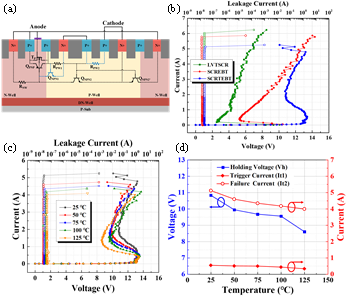 图1SCRTEBT器件的(a)横截面示意图,(b)TLP测试结果,(c)不同温度下TLP测试结果,(d)ESD性能随温度变化趋势。