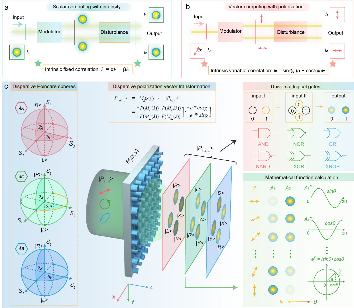随着我们步入信息时代,对海量数据处理不断增长的需求促使人们不断探索当前数字计算模式的高速、低能耗替代方案。在此背景下,基于超构表面的光学模拟运算应运而生。它具有高吞吐量的并行处理能力,能耗极低且速度极快,可以有效克服电子模拟运算存在的一系列局限,而且其平面化构型可以完美契合光子器件小型化和集成化的趋势。然而,现有的平台主要侧重于基于光强度的标量运算,这种计算对环境干扰高度敏感,并且主要局限于单个或一些基本的运算,这归因于输入和输出信号之间固定的数值关系。