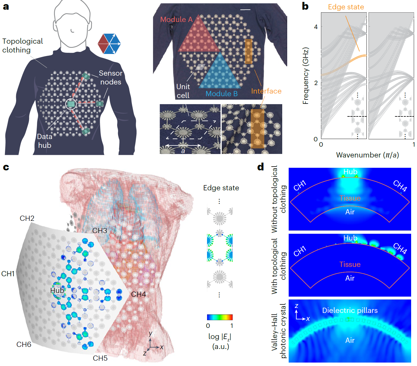 拓扑自由度可用于波的调控,能够实现超越传统器件设计范式。在对称性保护的拓扑序调控下,拓扑器件具有非平庸能带结构和拓扑边界态。这类设计已被广泛应用于光子超材料中,激发出新奇波动现象,诸如对缺陷和无序具有鲁棒性的波导等,并在激光器和光子源领域展现出重要的实际应用价值。然而,拓扑超材料与生物系统的集成研究仍十分有限,其主要受制于器件柔性不足、弯曲损耗较大以及在生物环境中能量耗散较高等挑战。此外,超材料与生物系统之间的柔性界面在人体传感网络中具有重要应用潜力。现有的人体传感网络要求兼具多功能与抗窃听性能,实现方法多采用线圈中继的微波近场,或人工表面等离激元超材料的表面波传输,这类方法的一维单元结构限制了高自由度、多功能人体传感器网络的实现。