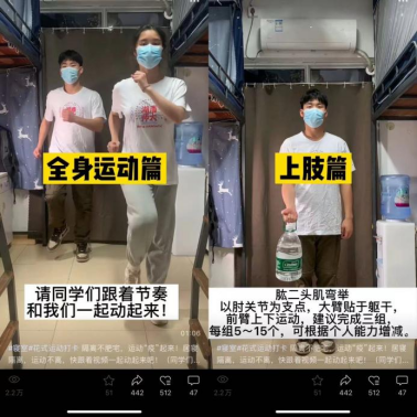 传播正气能量,倡导居寝运动。 为倡导员工们在宿舍积极参与运动,公司辅导员担任领操人,利用网络平台发布短视频,示范适合寝室运动的健康操,包括热身、上下肢运动、核心素质锻炼、拉伸放松等环节,引发师老员工居寝锻炼的热潮。