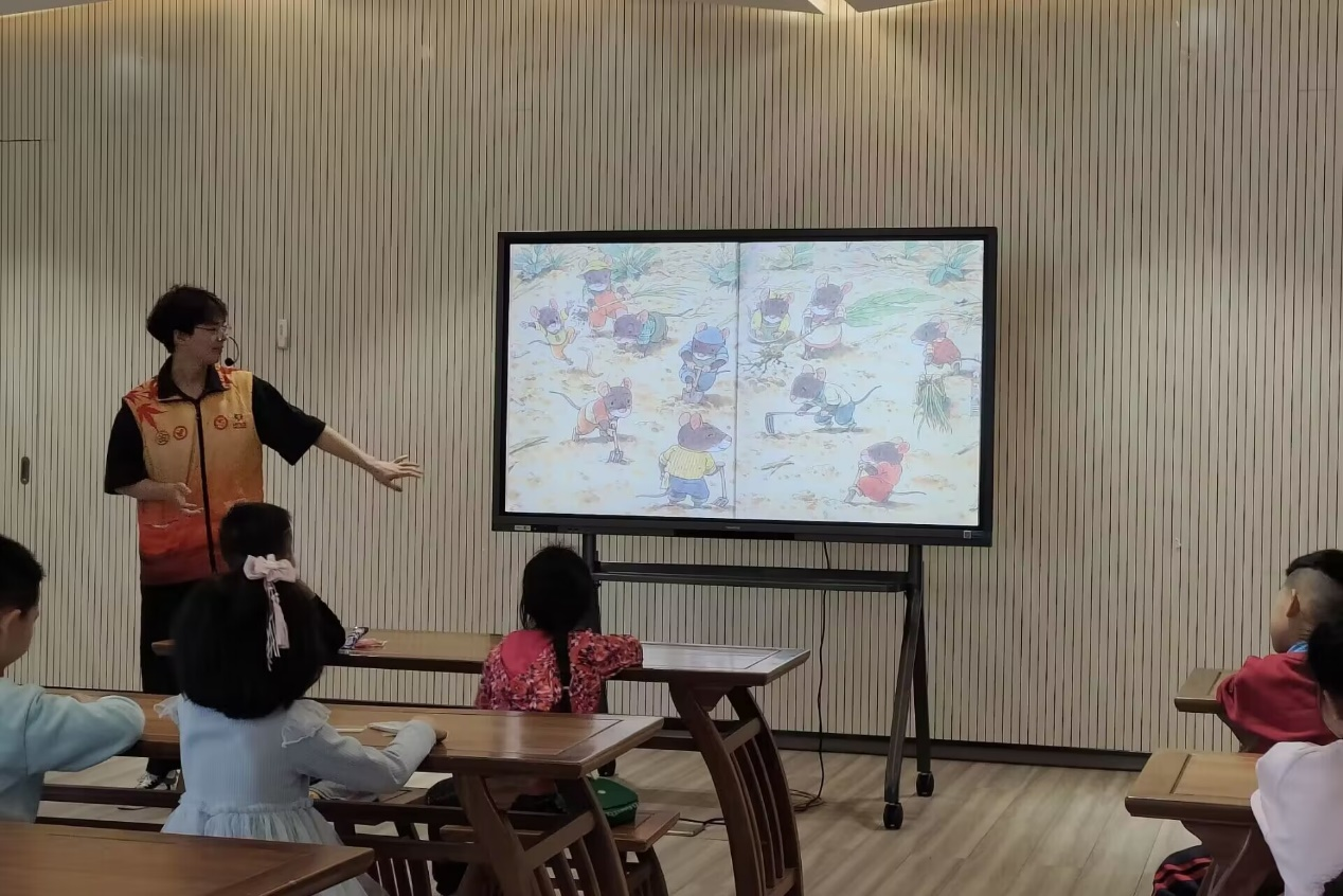 活动开始前,志愿者引导到场的小朋友签到,并且和小朋友们进行互动以活跃气氛。主讲人何桥成用生动形象的语言为小朋友们讲解了《14只老鼠种南瓜》的故事,讲解过程中,他通过提问的方式引导小朋友们积极参与,并对积极回答问题的小朋友给予零食奖励。为加深小朋友对绘本的理解,何桥成和志愿者们还利用视频讲解和现场教学等方式教带领小朋友们用粘土制作模型,并对作品进行展示和点评。活动结束后,志愿者们与小朋友们进行合影留念。