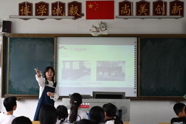 课堂上,涂月华通过回顾中国从过往至今的变化来引入主题,重点介绍了中国共产党对中国发展起到的重要作用及所做伟大贡献,并播放中共一大相关视频,结合红船精神,为同学们讲述了党的奋斗史,进一步诠释了伟大建党精神的内涵。她认为,不忘历史才能开辟未来,增强历史自觉性才可更好发展。她组织同学们绘制“请党放心,强国有我”主题手抄报,同学们运用收集到的资料,精心设计手抄报版面,发挥丰富想象力,紧绕主题进行创作,追述了党的光辉历史。