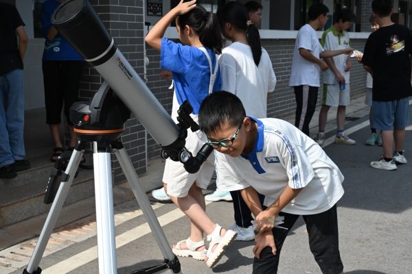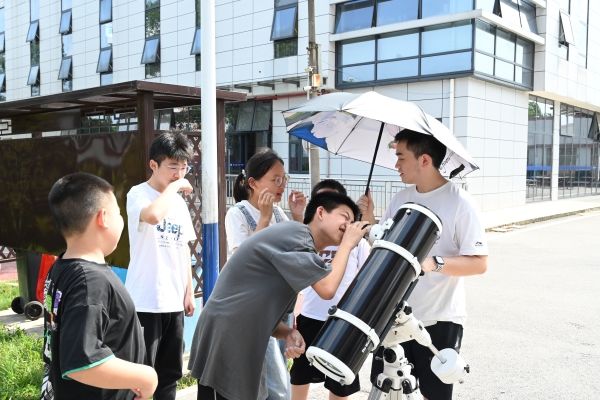 操场上,支教队将组装好的天文望远镜对准太阳,进行多次调试,确定在望远镜上可以观测到清晰的太阳黑子后,为孩子们讲解望远镜的正确使用方法,开始组织孩子们进行观测。孩子们严格遵守秩序,在讲解员的辅导下,依次进行观测,并发挥想象力去思考“太阳黑子是什么?”“为什么会出现太阳黑子?”。孩子们的大胆猜测与积极思考得到了讲解员们的充分肯定,增强了他们学习天文知识的荣誉感和使命感,营造了积极的活动氛围。