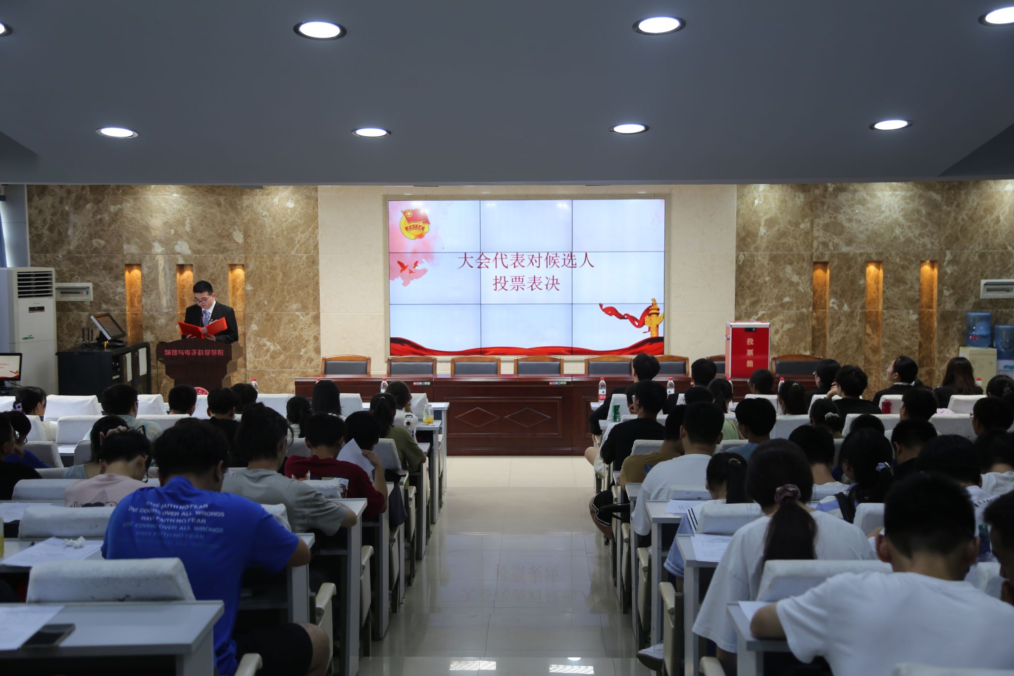 院团委员工副书记颜明伟、员工会主席团成员向婷、学社管主任汤子涵、青传主任戴一鸣和团委青发部部长尹德莉依次上台作2022-2023年度院团委、员工会、学社管、青传和提案工作报告,代表们对所有报告进行了投票表决。