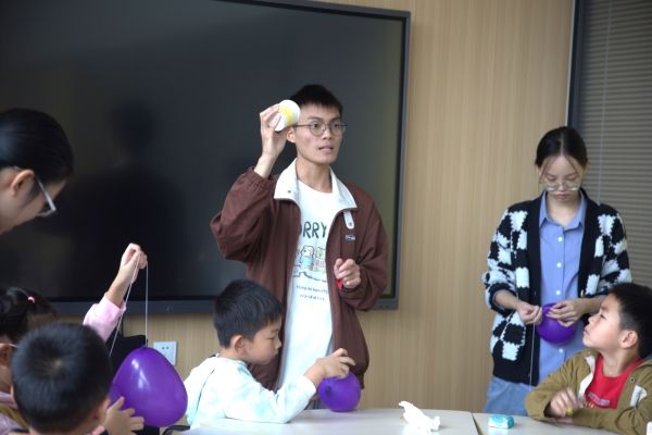 活动内容主要包括彩虹泡泡龙、空气炮、带电的气球三个趣味物理实验。志愿者们向大家讲述了实验步骤,对实验原理进行了详细解说,同时介绍了其中包含的基础物理知识及其在生活中的实际运用和意义。在彩虹泡泡龙实验中,志愿者们将涂满色素的纱布套在瓶口,并指导小朋友们往里吹气,无数整齐排列的小泡泡在表面张力的作用下形成了彩虹泡泡龙;空气炮制作实验中,小朋友们在志愿者的指导下进行气球与塑料杯的套装,通过拉伸气球尾部释放杯中压缩气流冲击纸片,体验到了空气炮的“威力”。带电的气球实验中,志愿者给每位小朋友发了两个连在一起的气球,摩擦头发后,气球发生的排斥现象让小朋友们体会到了静电效应的奇妙,也引起了更多孩子对物理的探索之欲。