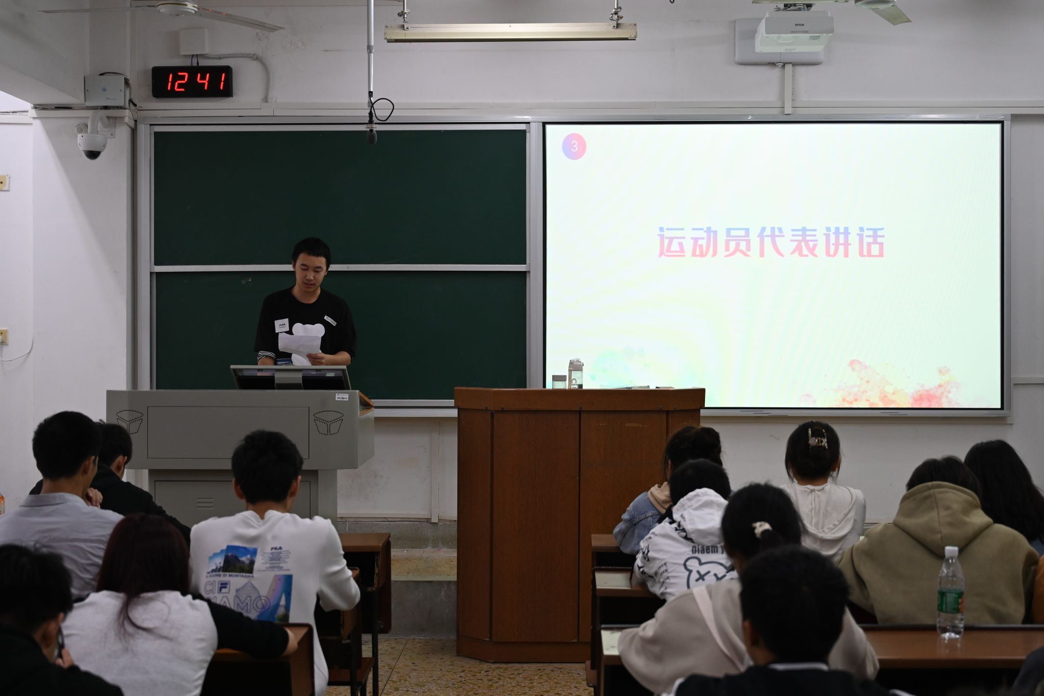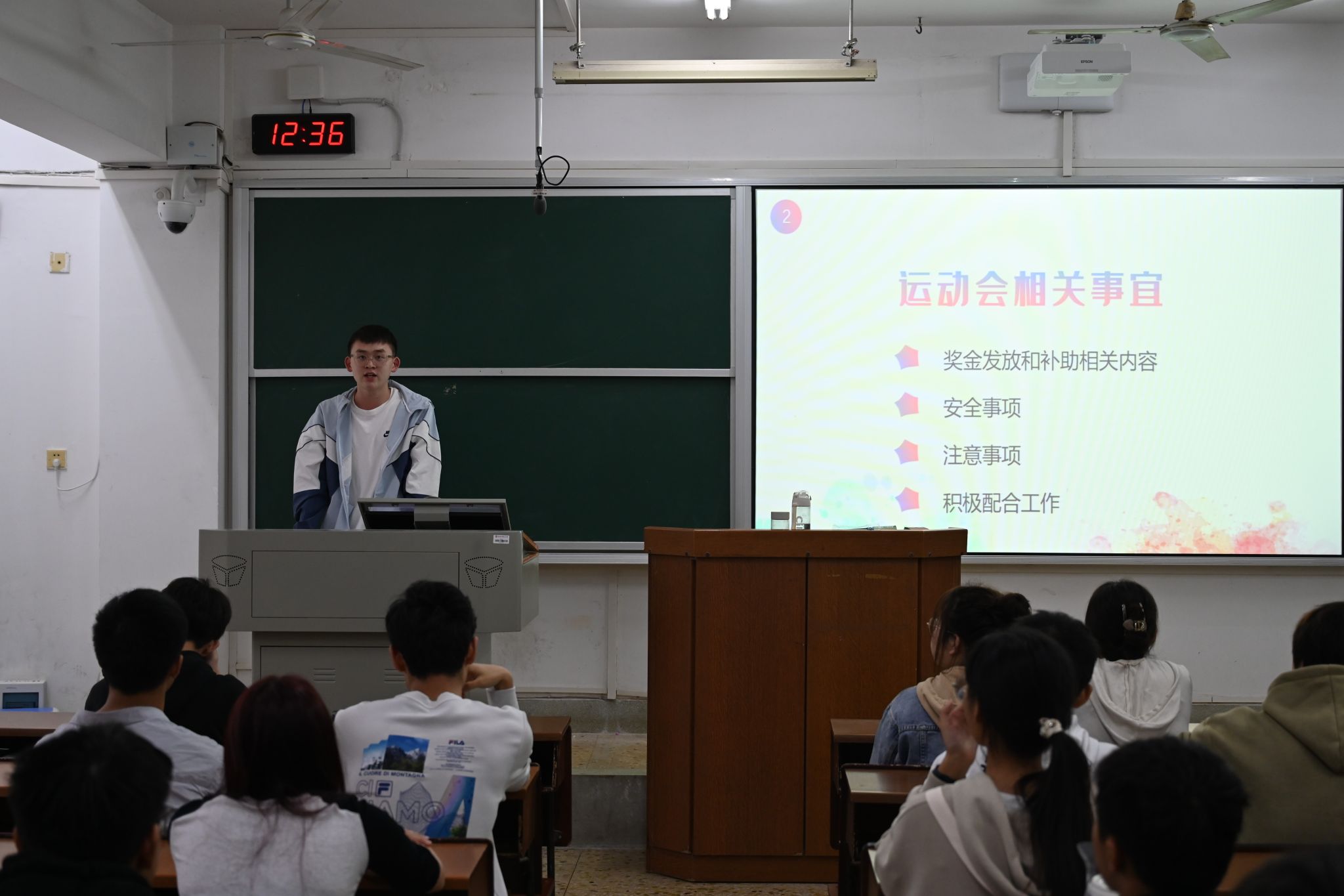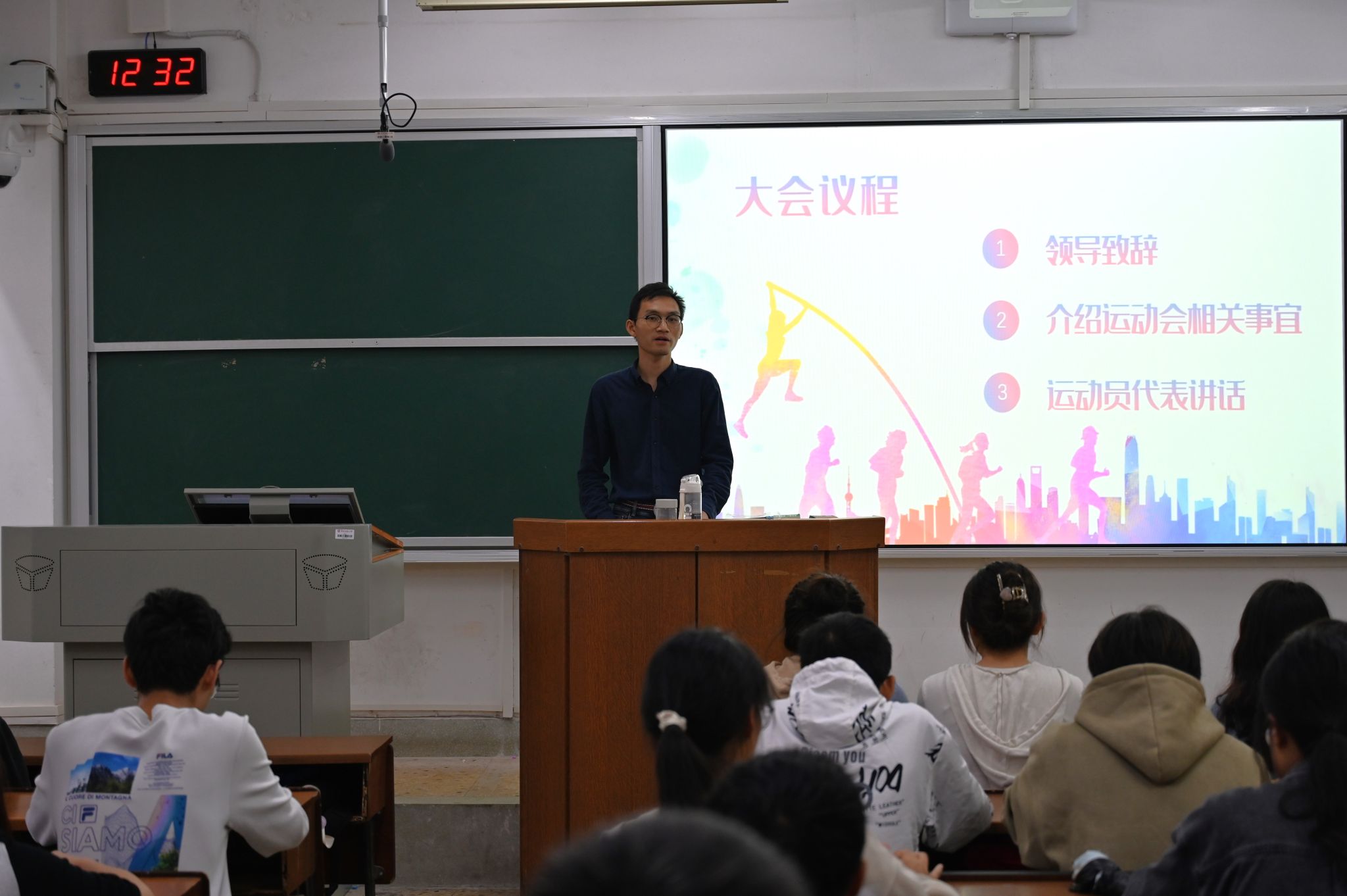 文体部干事廖煦平向参会运动员们介绍了运动会相关事宜及运动会的奖金与补助发放等奖励机制。运动员代表罗杰向运动员们分享过往比赛体验。他认为校运会是物电院学子体现坚强意志的机会,希望运动员们能从运动中感受快乐、勇往直前,为公司争得荣誉。