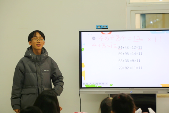 志愿者们带领小朋友们有序进行签到落座,并在随后的授课过程中协助主讲人维持现场秩序。粟畅通过PPT授课的方式教给小朋友们简便的运算方法和速算技巧,从而提高他们的速算能力。他与小朋友们多次互动,并不断鼓励小朋友们自主思考,积极回答问题。在他的鼓励下,小朋友们争先举手上台解题,分享自己的解题方法。此外,他还通过例题演示的方法加深小朋友们的理解,并通过习题训练的方式检验小朋友们对所学方法的掌握程度。