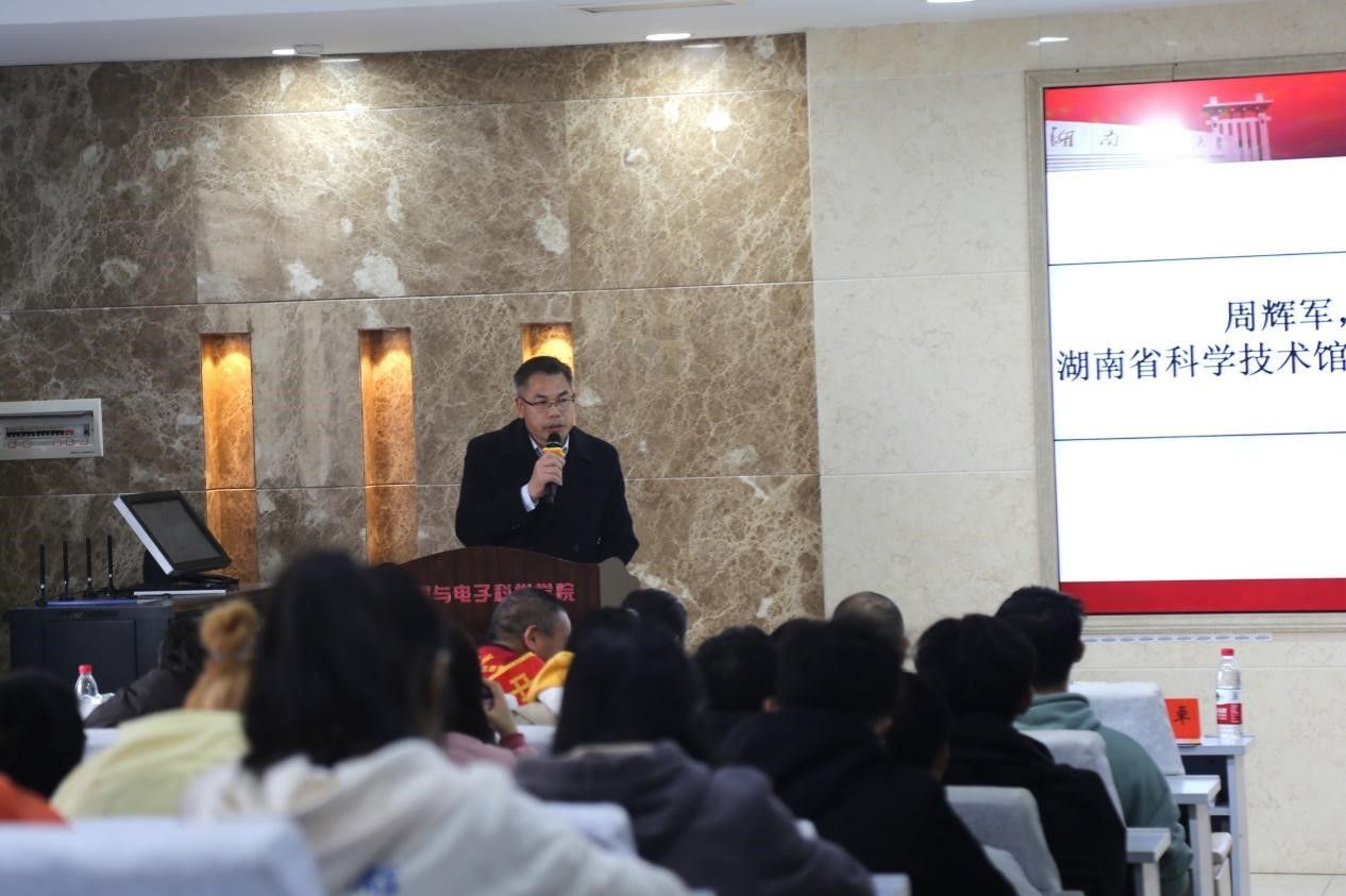 周辉军对志愿服务团队不断进步而感到自豪。他分享了在湖南省科技馆志愿者的服务心得,表达了自己对于志愿者精神的理解,详细介绍了科技馆志愿服务岗位,鼓励同学们报名参与科技馆志愿服务。