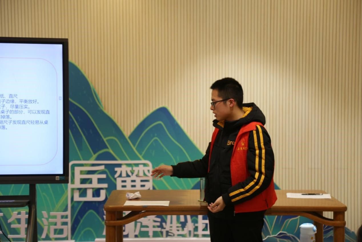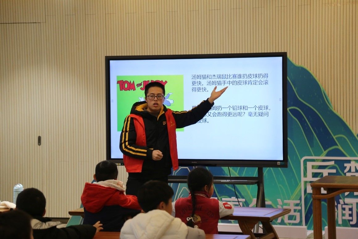 黄浩男为小朋友讲解绘本“无处不在的力”,他从牛顿三大运动定律引入,通过播放动画视频、列举例子、作提问等方式对三大定律依次讲解并提问,帮助小朋友理解抽象的概念,回答问题的小朋友也得到了志愿者们发放的零食作为奖励。在黄浩男的介绍下,小朋友们了解到两种生活中常见的力——重力和阻力,同时在纸张、水瓶等下落运动的演示实验中直观地感受到了重力和阻力的作用。实验环节中,志愿者为小朋友们分发实验材料,黄浩男带领小朋友用尺子和纸张完成与大气压强相关的实验,小朋友们进一步体验到了力所产生的作用。
