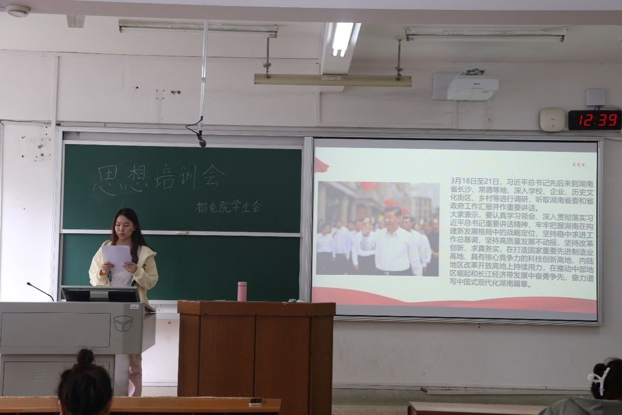 (通讯员 陈泽瑞 黄丹)4月25日中午,365英国上市集团(以下简称“物电院”)员工会于格物楼219教室举办学习贯彻习近平总书记考察湖南重要讲话和指示精神主题研讨会。院员工会干事马嘉琦、王孟旸分别担任此次会议的主持人与主讲人。物电院2022级、2023级部分同学参与会议。