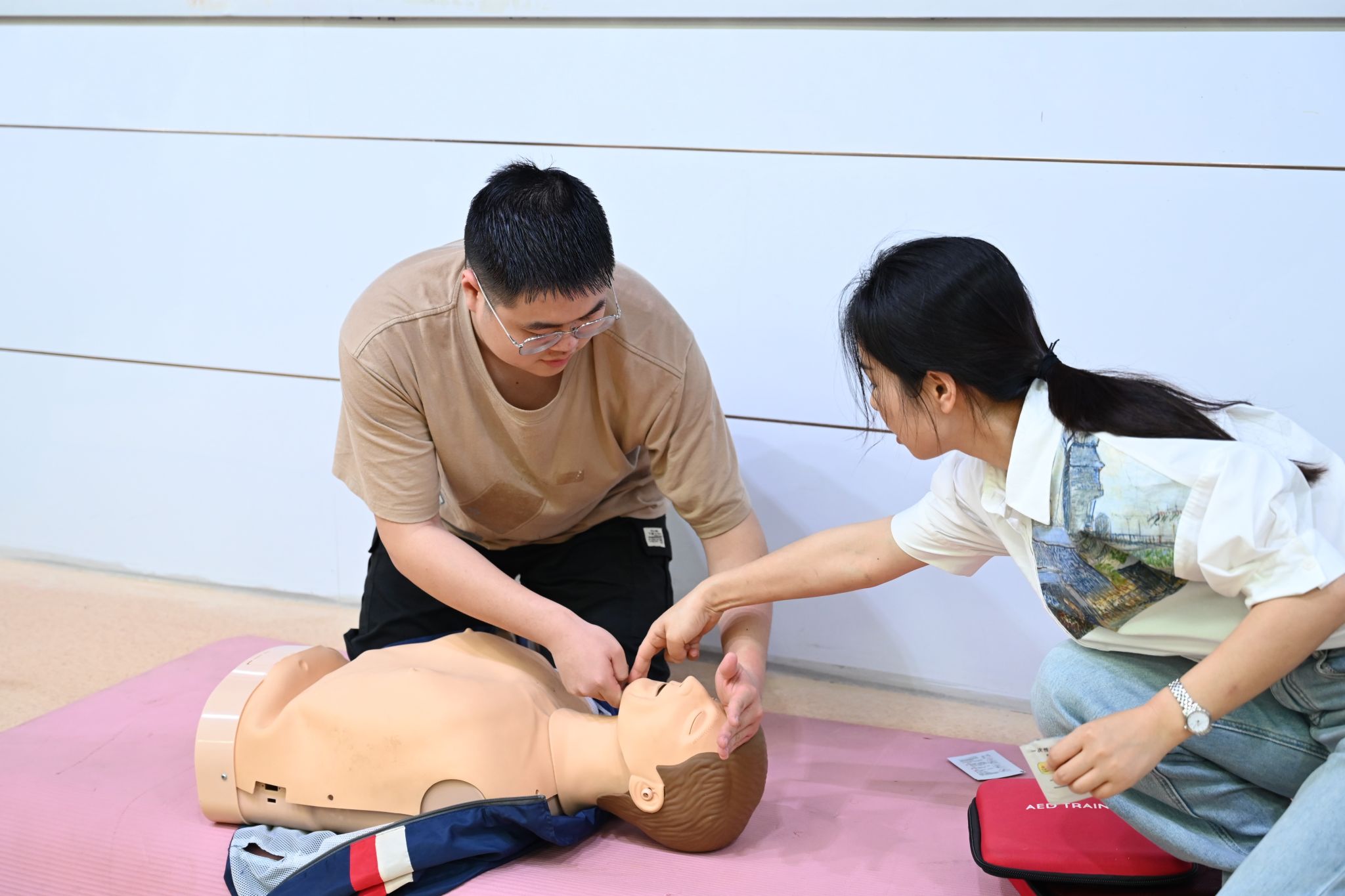 急救实训环节,员工上台实践操作,在两位医生的辅助下依次对人体模型进行紧急救护实操。通过实训,同学们身临其境地感受了急救的氛围,并掌握了基本的急救知识,达到能正确采取急救措施的目标。培训结束后,参会员工于线上进行题目考核,检验急救知识与技能的掌握程度,加深对急救知识的理解。