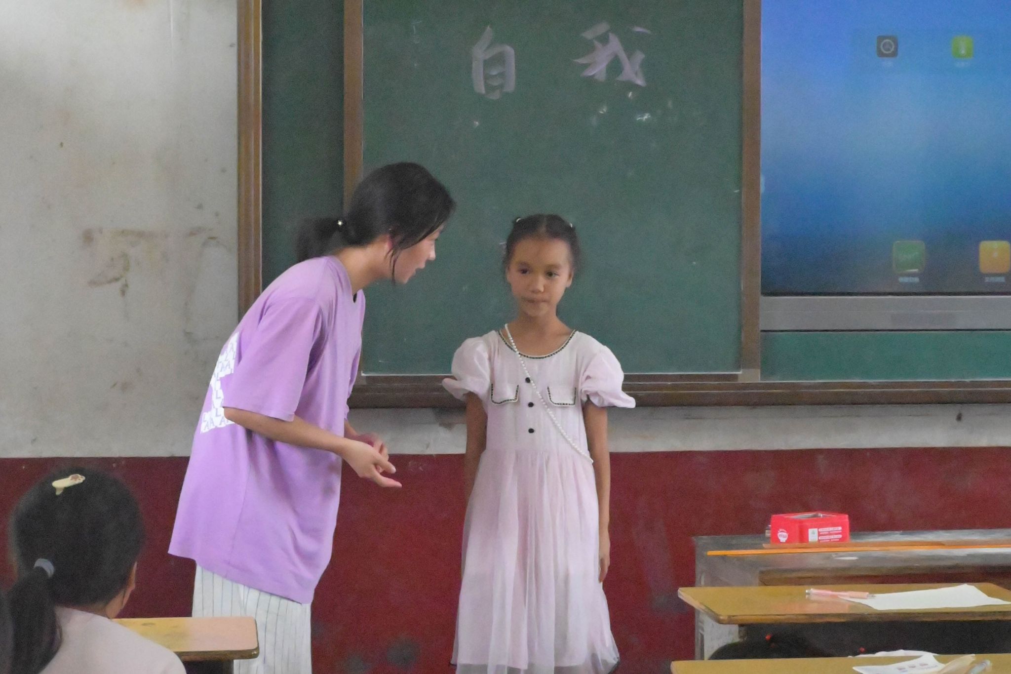 7月8日下午,入学第一课正式举行。员工们被分为两个班级。支教队成员刘娟、殷梓萱等人组织小朋友们进行自我介绍。为拉近与小朋友之间的距离,多名支教队成员率先介绍自己,他们在黑板上写下自己的名字,并向小朋友阐述自己的理想。员工们受到队员们的鼓舞,也大胆地上台进行介绍自己和未来的目标。