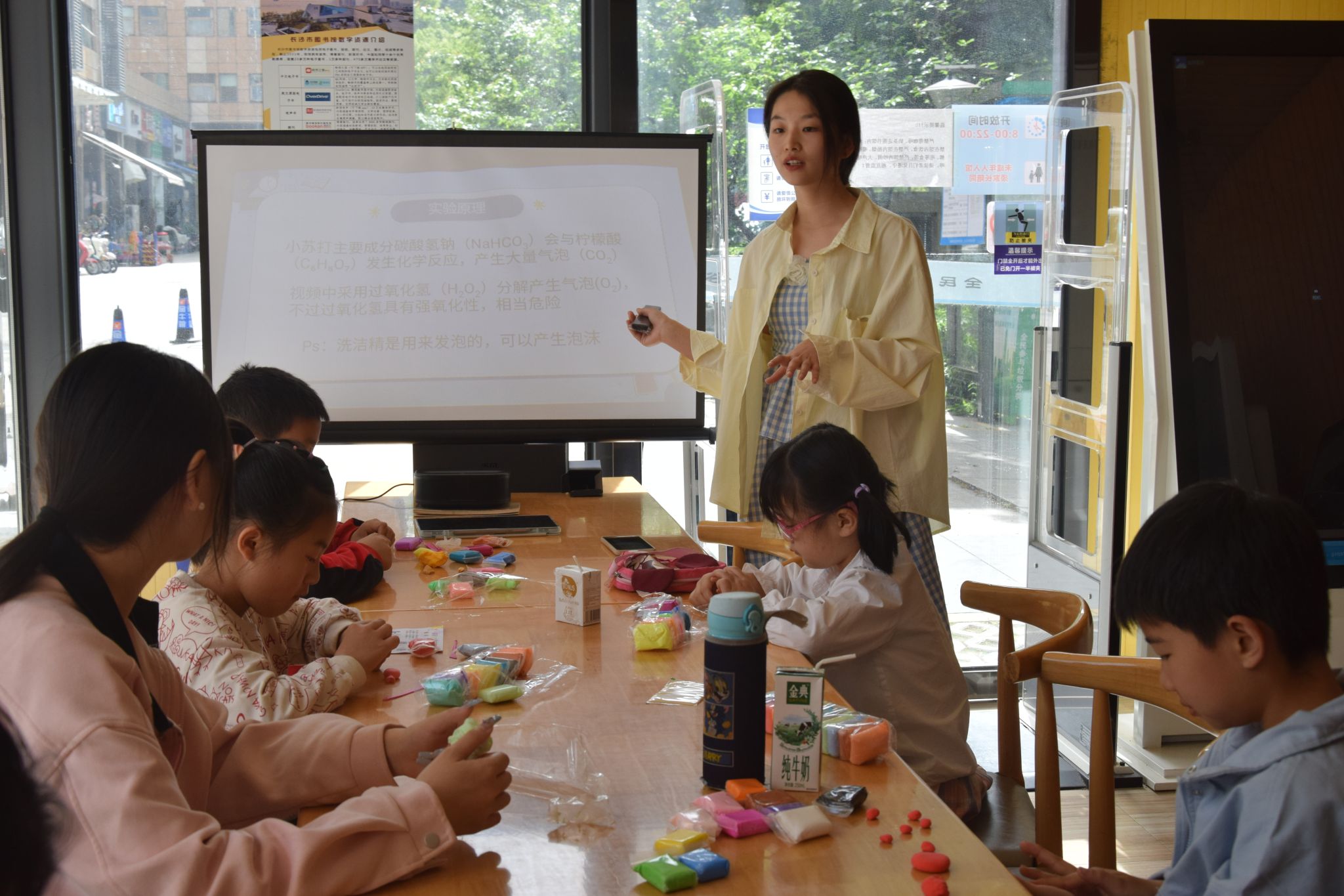 朱栗萱以“烟花探秘”为主题,通过绘本阅读、科学实验和趣味手工三大环节开展“阳光周末公益课堂”,引领孩子们探索科学的奥秘,激发他们的创造力。她借助绘本《烟花》引入课堂,向孩子们讲解了烟花的形成原理与制作过程。观看科学小视频的过程中,朱栗萱引导孩子们思考提问,使孩子们对“大象牙膏”实验中泡沫宛如巨型牙膏喷涌而出的现象感到震撼的同时,还学习到“大象牙膏”实验的原理,即柠檬酸与小苏打反应生成了大量二氧化碳气体。