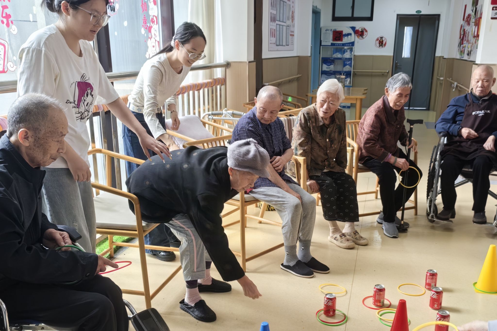 活动期间,志愿者们与老人进行交流,倾听他们讲述人生经历与生活往事。通过对话,志愿者们对老人们有了更深入的了解。在随后开展的“投圈”游戏互动环节中,志愿者们全程协助老人参与活动。她们根据老人的身体状况和行动特点,耐心指导投掷动作,协助调整发力姿势,同时在游戏中多次捡拾落地的软圈,并搀扶和鼓励有需要的老人。在志愿者一对一的协助与陪伴下,所有老人都顺利完成了游戏环节。活动现场洋溢着融洽的气氛,老人们在互动中体验到社会关爱的温度,活动也在欢快的气氛中圆满结束。