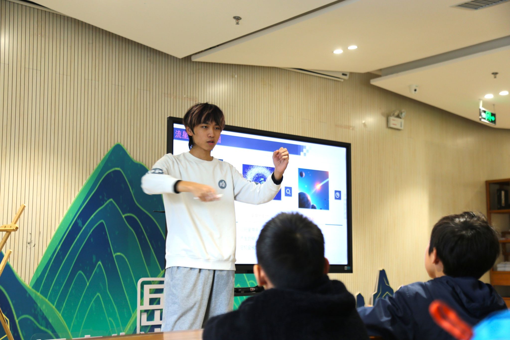 在读书会开始前,参与活动的小朋友有序入场并就座,现场志愿者协助引导,为活动顺利开展提供了支持。活动中,主讲人通过展示绚丽的星空图像,启发小朋友们思考流星的形成原理,随后用生动易懂的语言讲解了相关天文知识。在讲解过程中,辅以插画与视频材料,帮助参与者增强对流星现象的理解,并拓展了天文观测方面的基础知识。现场小朋友积极参与互动并回答问题,主讲人则对提问作出解答并给予鼓励。在随后的手工环节中,志愿者组织亲子家庭共同制作望远镜,并耐心指导大家完成手工作品。
