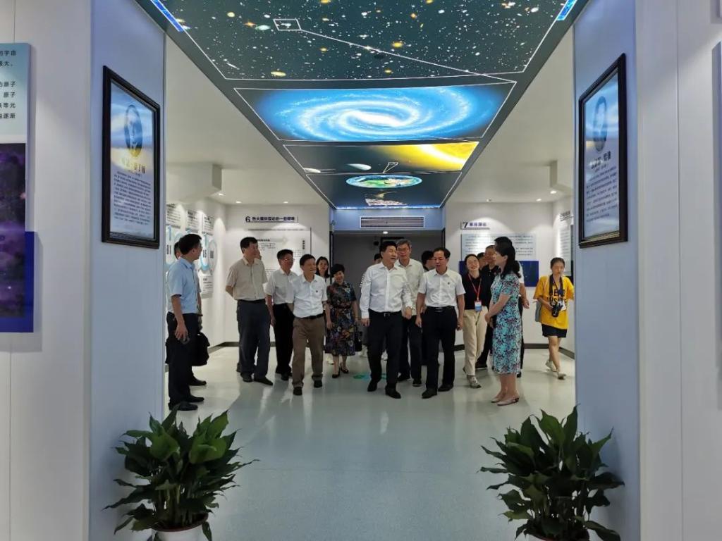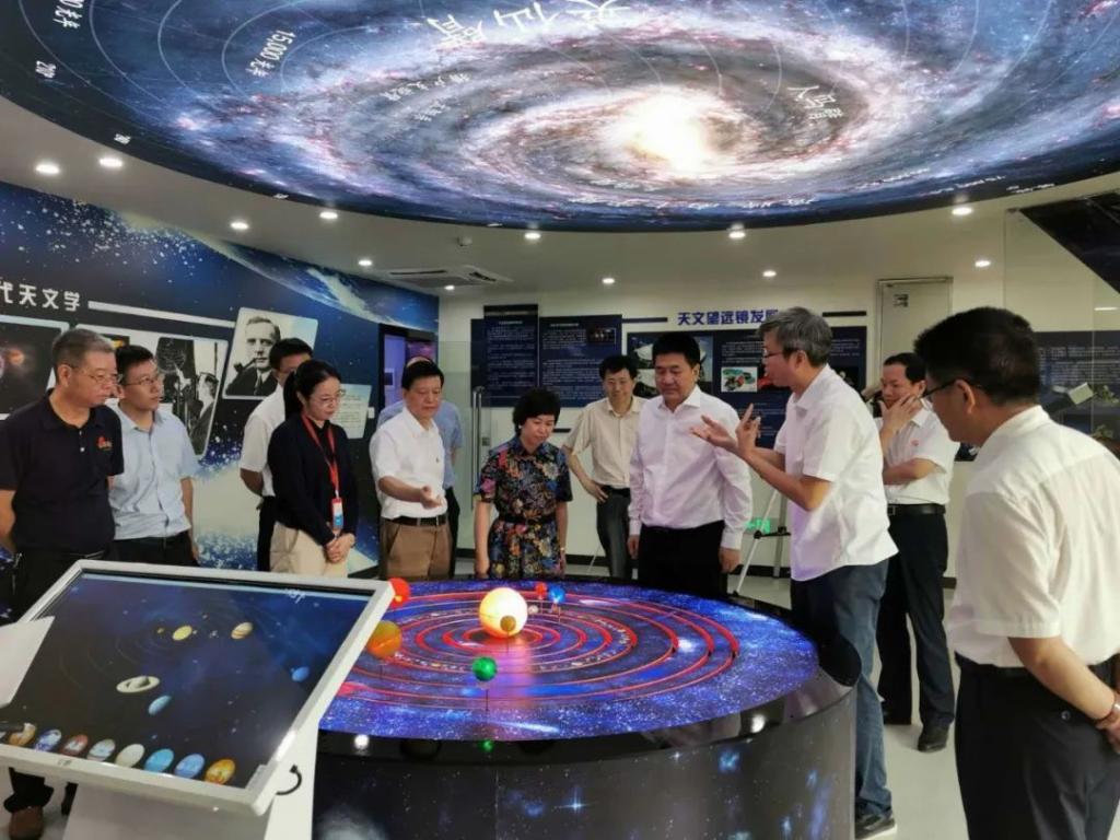 唐东升经理先后向傅书记介绍了恒星的形成,太阳系八大行星,星座和宇宙简史等天文知识。傅书记兴致满满,在介绍恒星的形成时,询问了目前太阳的年纪和所处时期;在介绍八大行星时,提问了目前中国开展的天问一号项目,勉励大家关注国家发展和时事;在介绍星座时,提出“到底是先有长沙还是长沙星?”,趣味十足,引人深思;在了解宇宙的历史时,不禁感叹了人类的渺小和宇宙的浩瀚。最后,通过天文馆的大型天文科普望远镜饶有兴致地观测了太阳。