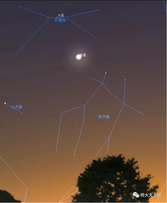 6月2日11:30,蜂巢星团在火星以南0.1°,此时火星亮度1.6等,虽然不是火星最亮的时候,但M44中的恒星全部暗于6等,对比之下,火星比星团中的恒星要亮得多。天黑后大约有1个小时的时间可以观测。