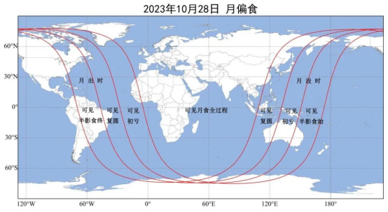北京时间2023年10月29日(力学时10月28日)将发生月偏食。这次月食,在北美洲东北部、南美洲东部、大西洋、欧洲、非洲、印度洋、亚洲、大洋洲西部、北太平洋西部、北冰洋、南极洲极小部分可以看到。本次月食自北京时间29日2时0分半影食始、3时35分初亏、4时14分食甚、4时54分复圆、6时28分半影食终。全部过程历经4小时28分钟,其中本影食历时1小时19分钟。