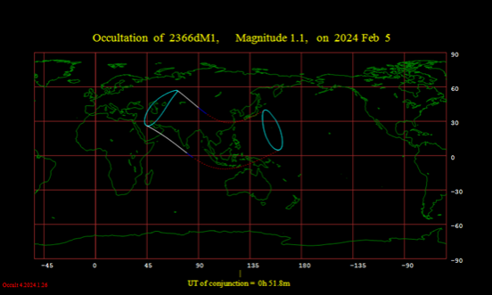 北京时间2024年2月6日(星期二)凌晨0时30分左右,推定直径约45.3公里、视星等14.39等小行星(497)Iva掩巨蟹座8.24等恒星TYC 1944-01849-1(J2000.0坐标:赤经α08h32m30.89s,赤纬δ+25°03'56.88"),最长见掩时长3.3秒,减光(亮度下降,dmag)6.2等,月球在地平线下。