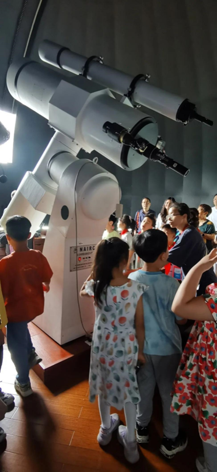 但只是听听,还不够满足好奇心,孩子们还想体验体验!当大望远镜一映入眼帘,小朋友们立马被震撼住了。随之讲解员把圆顶打开,并转动起来,小朋友们再一次惊叹起来。“哇!太酷啦!”