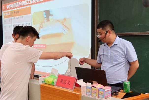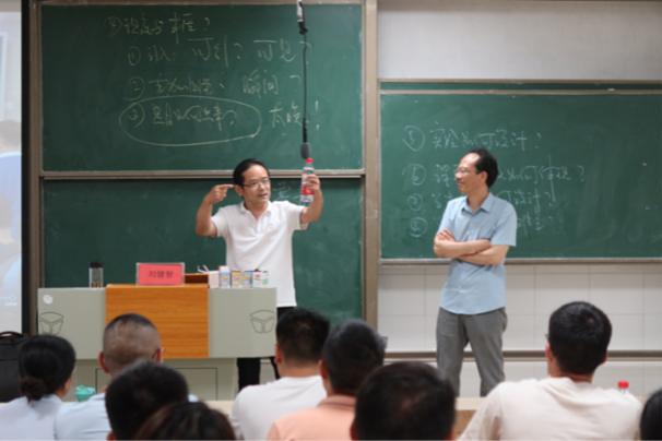 7月25日上午,湖南第一师范公司吴昌义教授带来了《中学物理演示实验设计与探索创新》专题讲座。本节讲座帮助学员们对实验教学有了全新的认识,物理实验课要就地取材、充分利用生活中的器具进行物理实验、加强物理知识和生活联系等等。他鼓励学员们在今后的物理实验教学中集思广益,不断探索改进实验方法,提高分组实验中员工的动手、操作能力和演示实验的可见度,全面提高实验课堂教学效果。