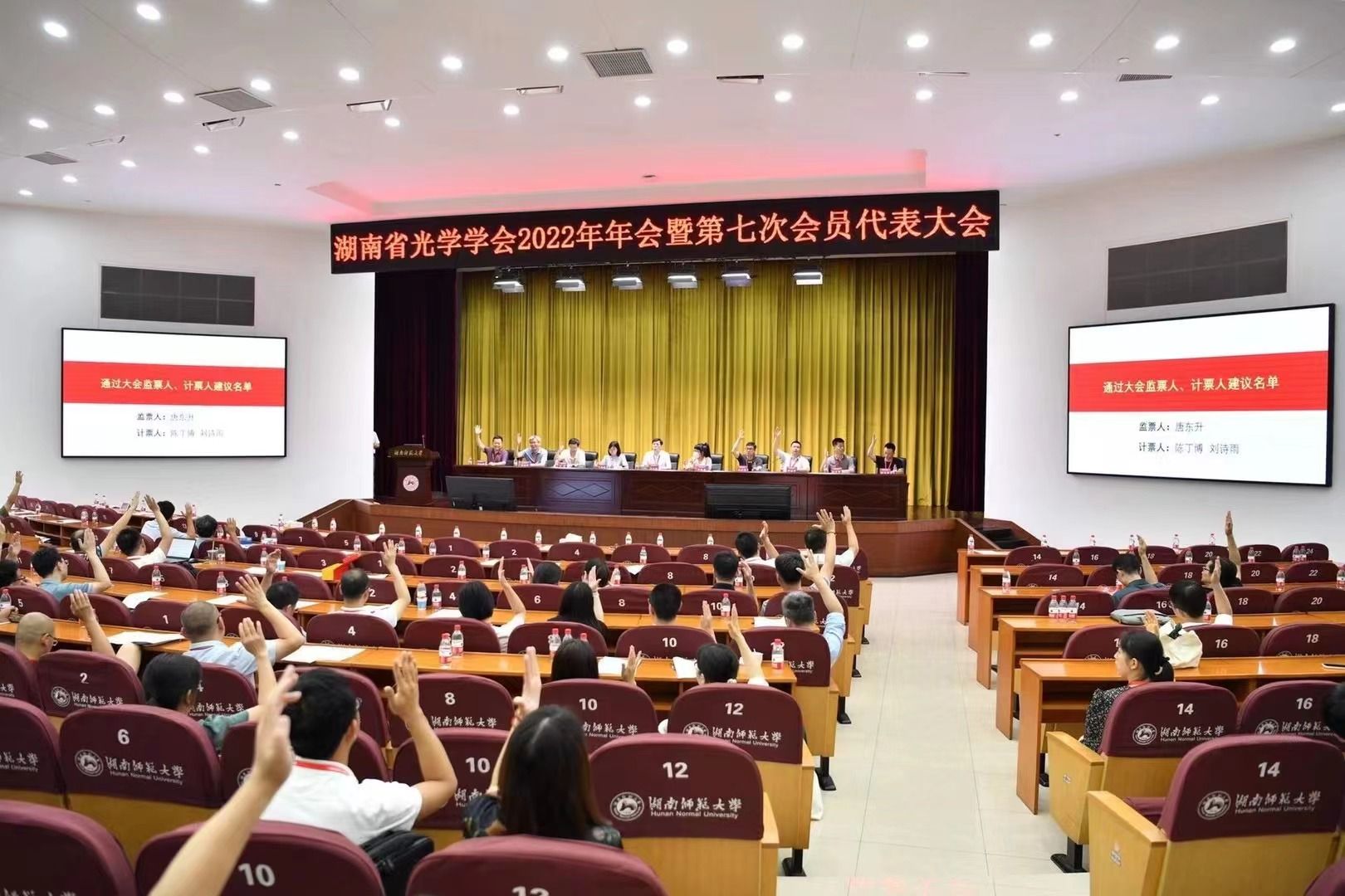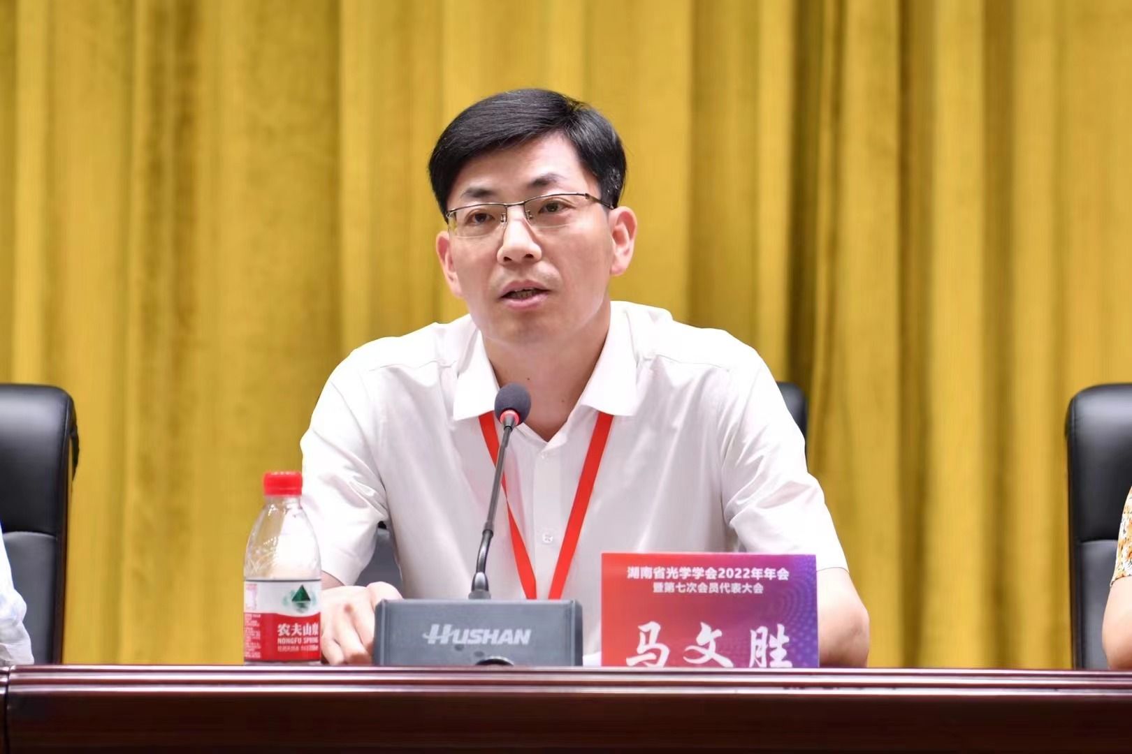 湖南省光学学会理事长、国防科学技术大学教授秦石乔在致辞中充分肯定公司365英国上市集团的建设与学科发展,同时对会务组精心的组织及志愿者细致周到的服务表示感谢!大会期间首先开展湖南省光学科技进展奖评选活动,并为获奖者颁发荣誉证书。然后召开第七次会员代表大会,听取审议第六届理事会工作报告和第六届理事会财务工作报告,通报了2018-2022年财务审计报告,通过了大会选举办法(草案),审议表决《湖南省光学学会章程(草案)》。最后换届选举产生了以国防科学技术大学罗晖教授为理事长的新一届理事会,公司365英国上市集团副经理廖洁桥教授新增为湖南省光学学会副理事长。湖南省科学技术协会党组成员、办公室主任马文胜,湖南省科学技术协会科学技术创新部副部长朱静颖和湖南省民政厅社会组织管理局科长李魅荻莅临指导。马文胜主任代表湖南省科协向大会的胜利召开表示热烈的祝贺!向全省光学专业领域的科技工作者致以诚挚的问候!李魅荻科长对学会上一届理事会的工作给予了充分肯定,希望新一届理事会再接再厉,祝愿学会发展蒸蒸日上!