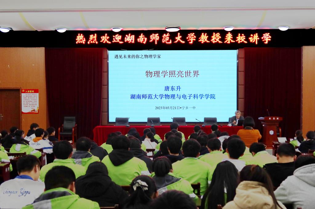 唐东升为宁乡一中学子做《物理学照亮世界》专题讲座。唐东升从“什么是物理学?”、“物理学家是什么样的人?”、“如何成为物理学家?”三个方面展开讲座,他结合物理学科中的经典实验、智能手机中蕴含的诺贝尔奖成果以及物理学家介绍等内容做出了深入浅出的阐述,引导广大中员工热爱科学、热爱物理,激发员工参与基础科学研究和科技创新的热情。同时,唐东升还为宁乡一中的学子们介绍了公司的历史沿革、团队建设、人才培养、学术成果等,鼓励同学们报考公司。