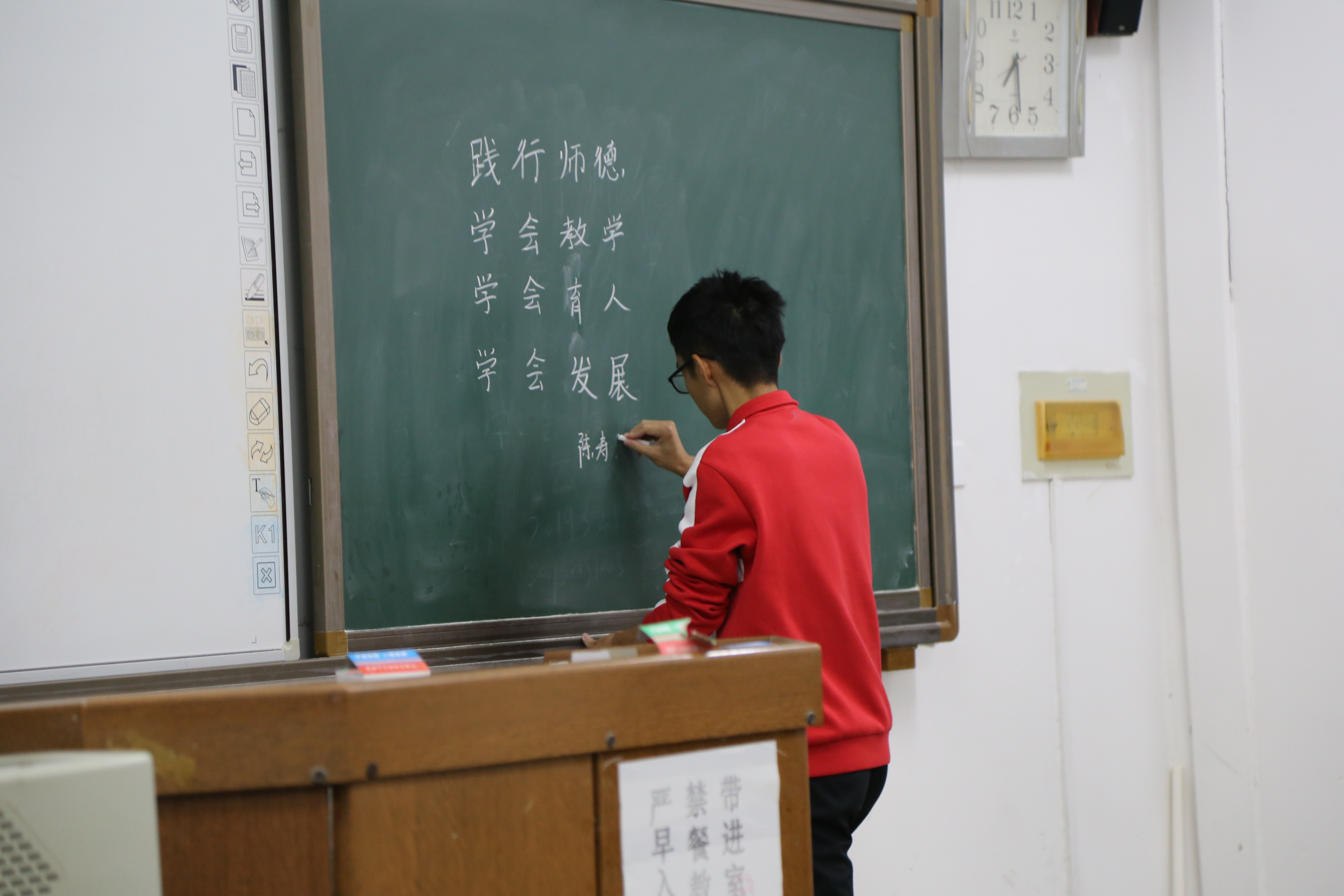 此次比赛分四个分赛场,每个赛场有两位评委老师。比赛采取现场书写指定文字内容的形式,选手两人一组,一同进行粉笔字书写,书写内容为“践行师德,学会教学,学会育人,学会发展”。评委老师根据评分标准进行现场打分并挑选出优秀作品进入决赛。