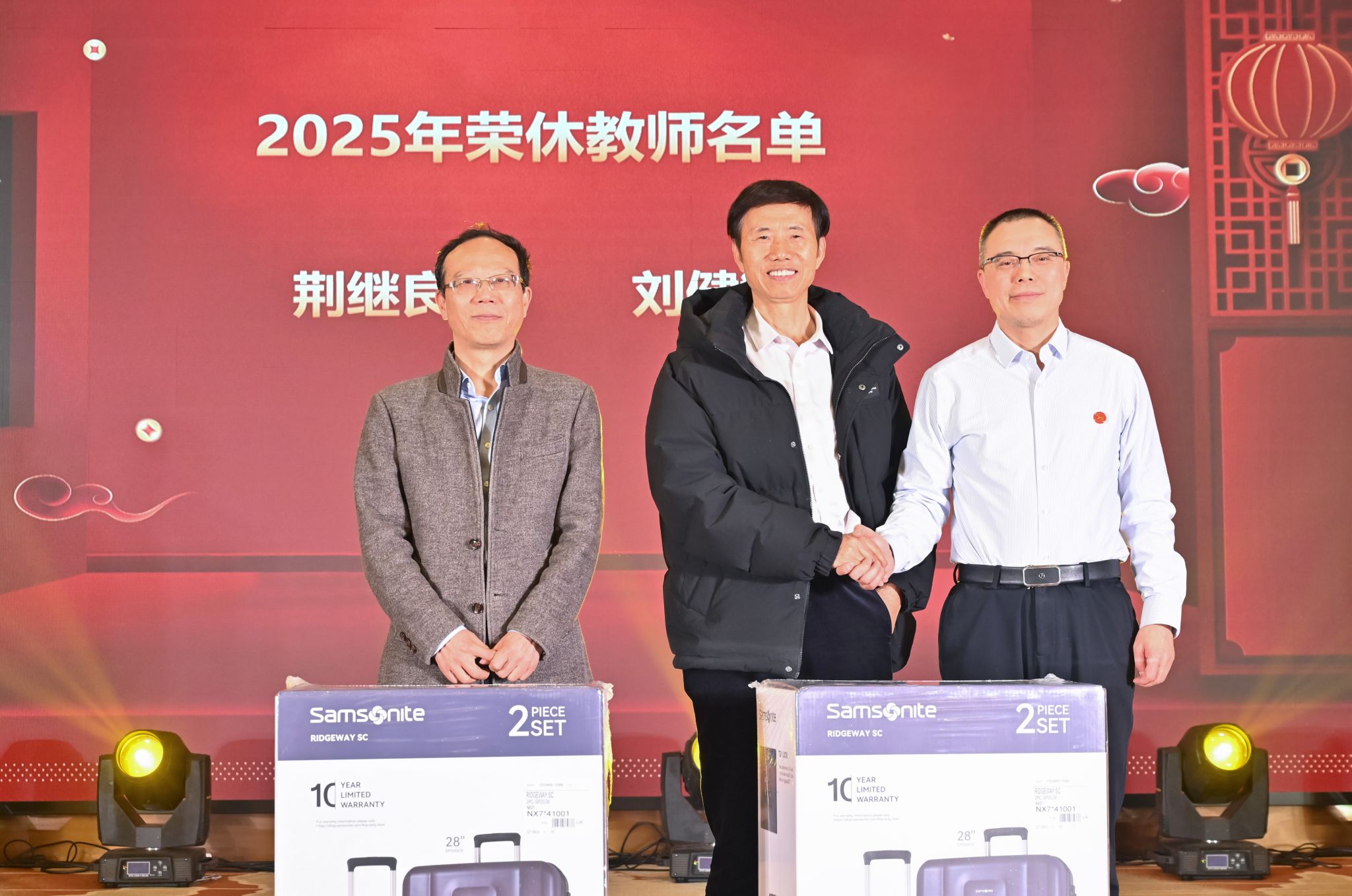 联欢会由周新星、翟亚新老师主持,在庄重温馨的教师荣休仪式中正式拉开帷幕。“三尺讲台育桃李,一生坚守铸师魂”,主持人深情致辞,致敬深耕教坛、默默奉献的荣休教师。荆继良教授、刘健智教授上台接受全体师生的敬意与祝福,他们用岁月与智慧照亮了无数员工的成长之路,现场掌声雷动,满含不舍与崇敬之情。