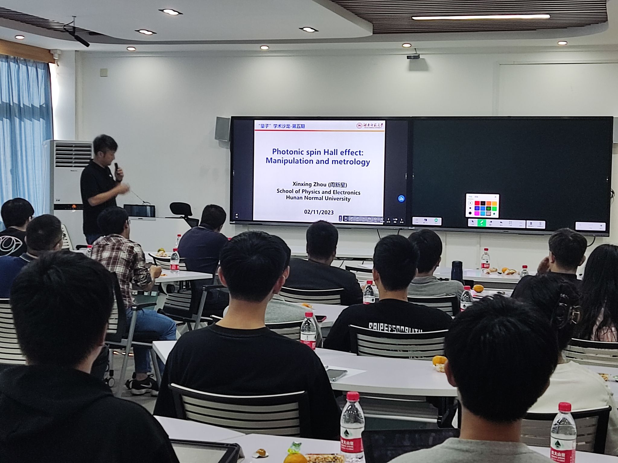 周老师围绕“Photonic spin Hall effect: Manipulation and metrology”这个主题主要介绍了以下三个方面的内容:(1)光自旋霍尔效应概念的提出和产生机制;(2)自旋光电子学领域的发展历程和最新的前沿进展;(3)周老师近年来在光自旋霍尔效应的探测与应用方面的最新研究成果。周老师报告深入浅出,逻辑清楚,在场师生收获颇多。