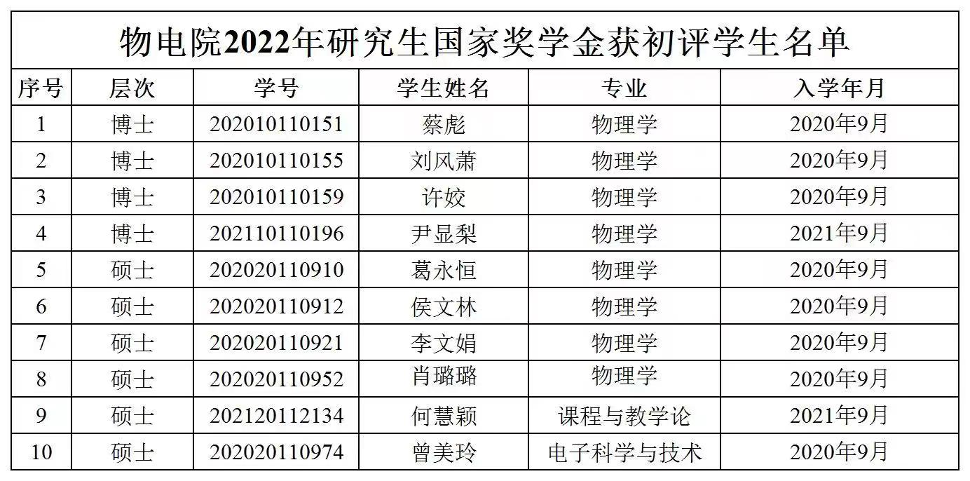 经本人申请,公司研究生学业奖学金评审委员会综合评定,现推荐蔡彪等10位全日制研究生为2021-2022学年国家奖学金获得者并予以公示,公示时间为5个工作日。如有异议,请于公示期内将情况反映至院科研办(电话:88872834)。